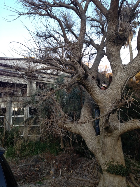 の、横の大木によじ登るちくりん。白黒にすると幽霊のようになります。