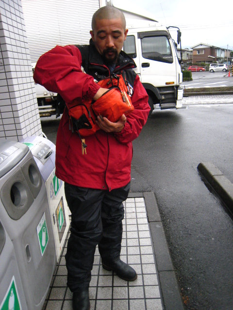 車で参加のカッシーは爽やかに襟を立てて登場。天候が回復傾向でバイク乗ってこればと悔やむ。